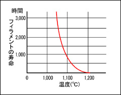 右の表は、熱風温度から類推できるフィラメント温度(熱風温度+400℃)に対するフィラメント寿命のめやすです。 |